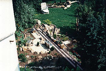Der rechte Anlagenteil vom 1.OG aus gesehen. Hinten der Felstunnel, vorn Durango fast in voller Länge