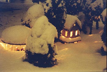 Licht und Schnee halten die Preiserlein nicht davon ab eine Party im Pavillon zu feiern. Vor dem Heimweg müssen sie aber noch kräftig Schnee schippen